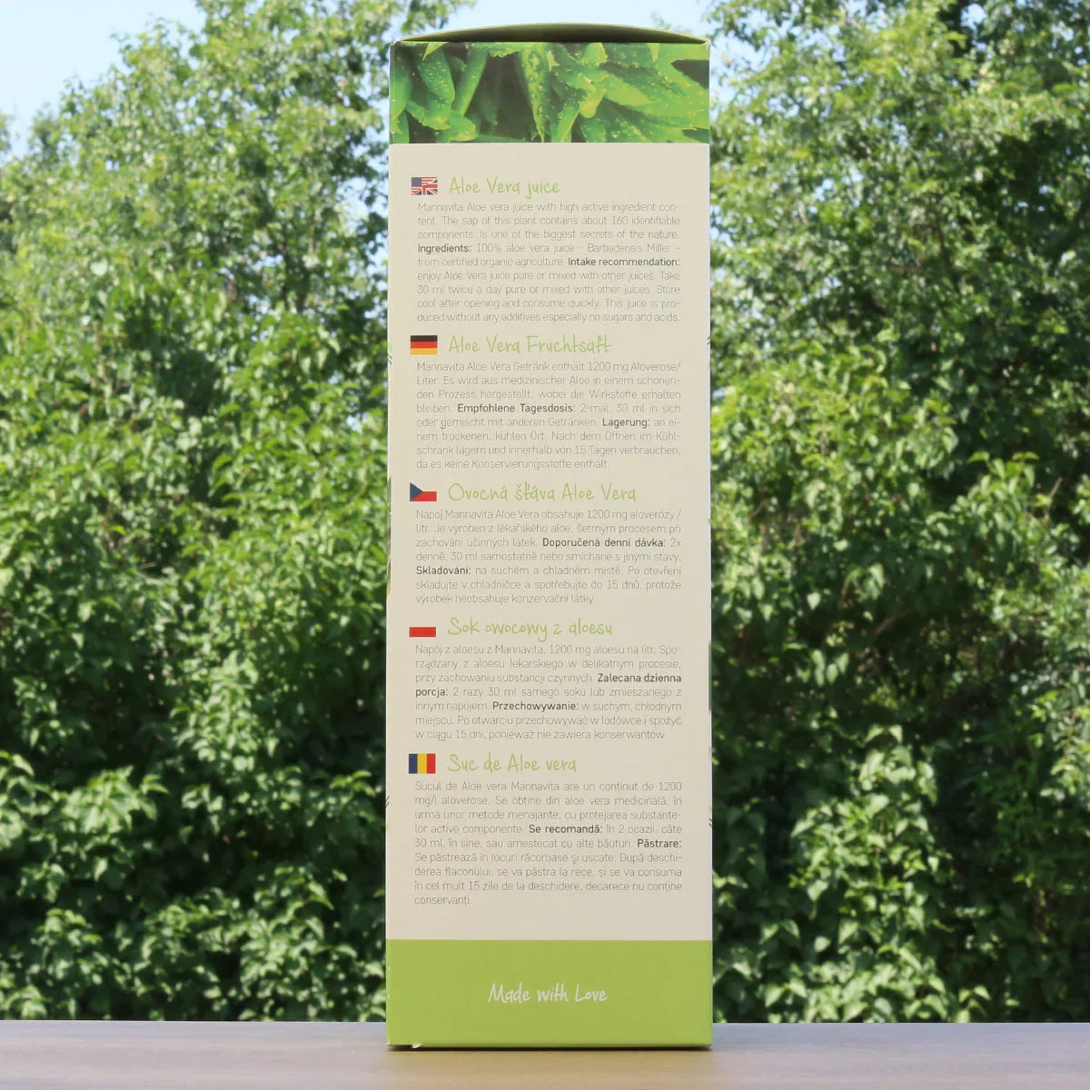 O sumo de aloe vera Mannavita é feito a partir de aloe vera medicinal (Barbadensis Miller) usando um processo suave. O seu elevado teor de aloverose—1200 mg/litro—torna-o adequado para utilização como parte de terapia para inúmeras condições. A aloe vera tem regenerando e anti-inflamatório efeitos sobre o estômago, intestino e pele. Pode ser aplicado tanto externamente e internamente.